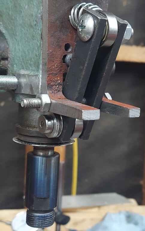 The quill on this machine has tons of slop. I need some way to eliminate this. So I made this contraption from scrap. What this does is uses a 608 bearing in a spring loaded arm to hold the quill to one side. This is crude but works well enough for what I'm doing.
