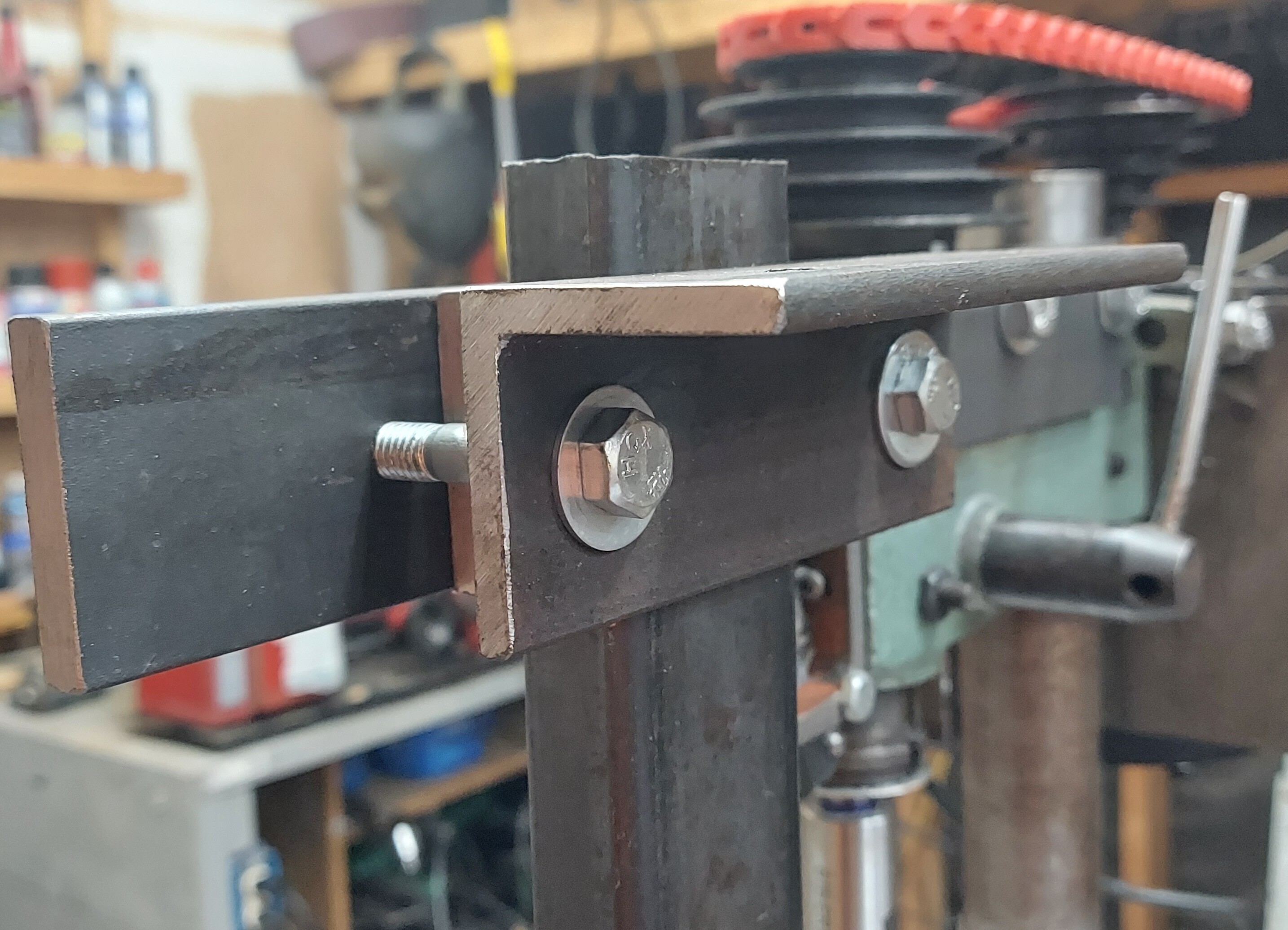 All this is is some scrap steel I bolted to the drill press. This gives me the ability to clamp to a front column. This converts the normal drill press structure that is basically a C-clamp into a square. Its substantially more rigid. All I needed to buy was some fasteners for this. There is no precision work because I setup the drill press with the column first then clamp the secondary column in place last. Yes, it's kind of in the way but I'm not planning on trying to bolt down an engine block to this any time soon.