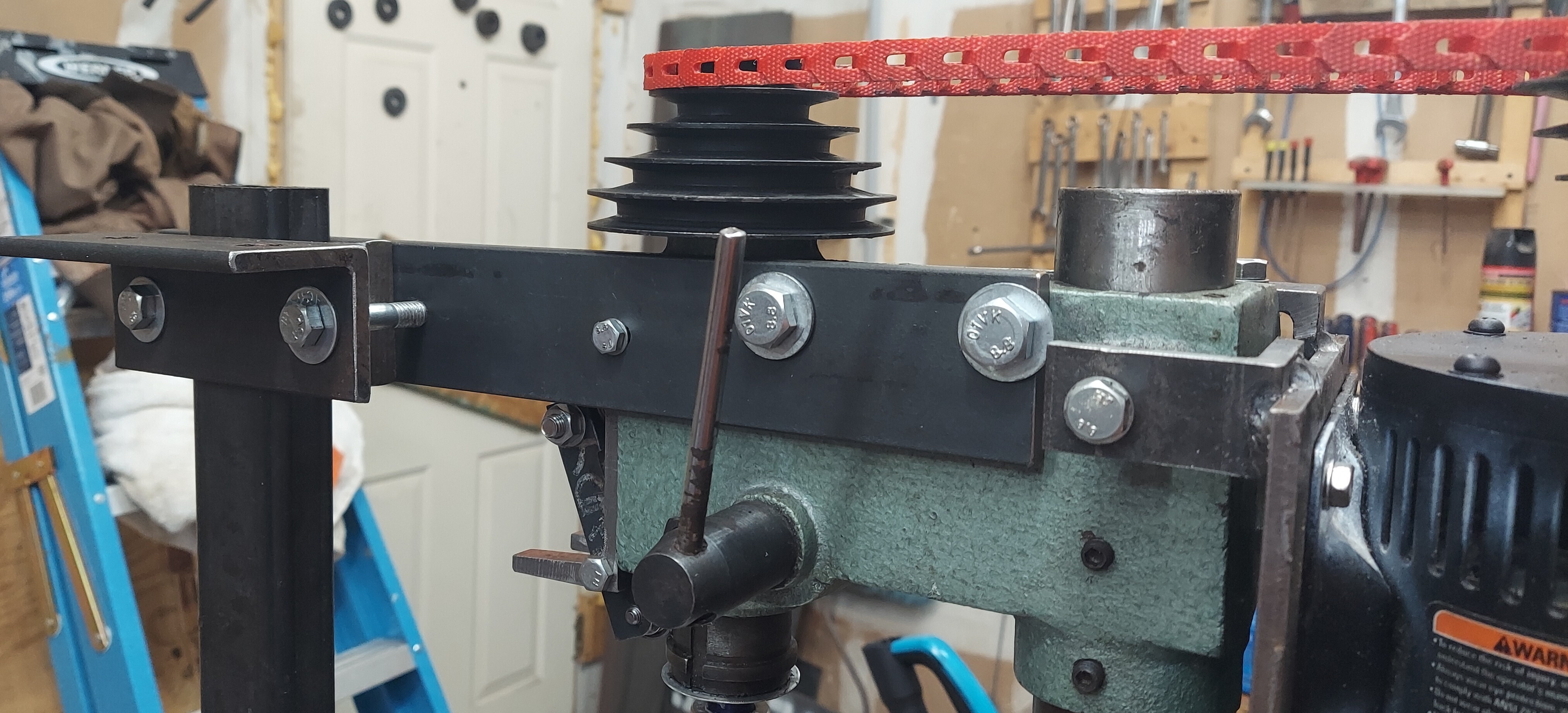 So I found a motor on facebook marketplace that had the same shaft size off a newer drill press. It cost me $20. I had to put new bearings in it but that was easy. I made a new motor plate from 1/4 steel I had. The original drill press tried to have the entire motor adjust. This isn't really practical. So I used the two "hinge" bolts they had and then picked up a third bolt from the set screw for the sliding pin. So the motor is now fixed in position. Since the motor can't be moved I ordered a 3/8th link belt. This is a belt you can make shorted by just taking out "links" which are just made of some sort of flexible material. This motor makes more torque and has twice the rated RPM.