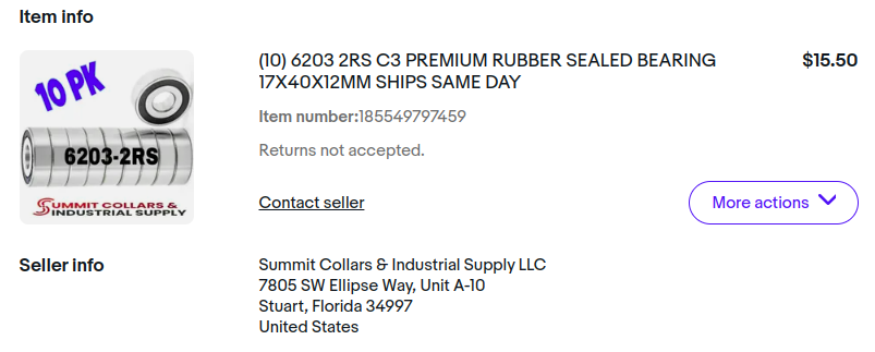 These bearings allow the shaft to rotate, which has the drill chuck on the opposite end. The top section of the shaft is squared off and rides in the top of the spindle pulley adapter. This is how the quill can move up and down while still carrying rotation. The top bearing I replaced with another 6201 bearing. The bottom bearing I wanted to put in a bearing that could carry load in all directions. After doing research I determined a tapered roller bearing was appropriate. This is basically a wheel bearing like you'd use in a car. Except in this case very small. The equivalent part number is "30201". The only source I found in the US for this had them starting at $18 each. After some searching I found them on AliExpress for basically nothing.